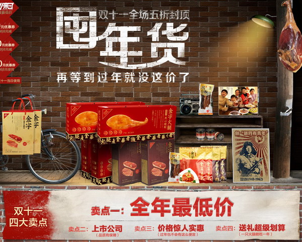 11月14日,在淘寶轟轟烈烈的雙十一活動(dòng)三天之后,金字火腿的工作人員終于把最后一批打包好的活動(dòng)商品搬到快遞公司的車(chē)輛上。與此同時(shí),淘寶雙十一火腿類目排行榜出爐,金字火腿毫無(wú)懸念?yuàn)Z得銷(xiāo)售冠軍。