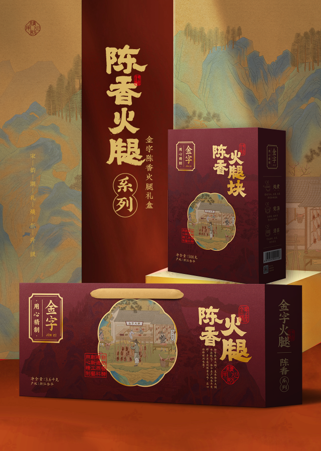 四大火腿系列:留香系列、陳香系列、典藏系列、兩頭烏系列,各自美麗又相輔相成。留香系列采用宋朝的天下第一色:紅色,喜慶、炙熱、勇猛;陳香系列采用宋鈞紅釉的朱色,低調(diào)、穩(wěn)重、靜謐;典藏系列和兩頭烏系列采用冷色調(diào):黑色、棕色,端莊、素雅、歸真。